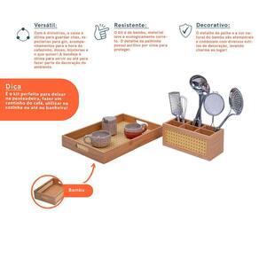 "Conheça o Kit com caixa organizadora de bambu e palhinha 6 nicos e bandeja retangular de bambu com palha da OIKOS.Multiuso, versáteis, duráveis e higiênicas, são ótimas para guardar e organizar acessórios, brinquedos, perfumes, potes e o que precisar! Caem bem em diversos ambientes e harmonizam com a decoração.A caixa é de bambu, MDF e plástico. A bandeja é de bambu. Para limpar, basta utilizar um pano úmido e deixar secar em local arejado.Leve qualidade e modernidade para sua casa!O kit contém:1 caixa organizadora de bambu e palhinha 6 nichos1 bandeja retangular de bambu com palha"