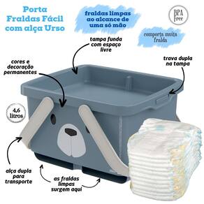 Kit Baby Urso 3 peças, composto por 1 Porta Fraldas tipo maleta com alça, 1 Mini Maleta Farmacinha com trava e alça e 1 Porta Lenço Umedecido com fechamento hermético. Todos os itens são fabricados pela Plasútil e produzidos em polipropileno de alta resistência e durabilidade, além de material atóxico livre de bisfenol (BPA Free) em sua composição. Decoração coordenada pra lá de exclusiva. Os produtos possuem cores intensas e vibrantes, pois são produzidos com tecnologia intra-imagem, que garante vida longa às decorações. Composto por uma seleção cuidadosamente projetada para atender uma boa parte das necessidades dos bebês de forma fácil e lúdica.