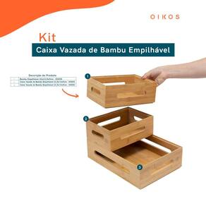 Esse é o Kit caixas organizadoras bambu empilháveis vazada 3 pç-OikosEsse kit contém:1 Caixa de bambu empilhável 32x23,5x9cm - Oikos2 Caixas vazadas de bambu empilhável 23,5x16x9cm – OikosEssa é a caixa vazada de bambu empilhável 32cm da OIKOS.Versátil: bacana para guardar e organizar acessórios, itens de escritório, brinquedos, potes e muito mais! Empilhável: você pode colocar uma caixa em cima da outra, além de deixar tudo bem organizado, otimiza o espaço no armário e na bancada. dica extra: dá também para empilhar tamanhos diferentes, fica lindo e bem prático.Alça vazada: o espaço na lateral facilita o manuseio e transporte por onde você quiser. Combina com tudo: cabe em diferentes ambientes. do quarto ao banheiro, da cozinha à sala!Decorativa: o design moderno e o tom natural deixam o ambiente mais charmoso, podendo fazer parte da sua decoração.Feita de bambu: material leve e ecologicamente correto.Essa é a caixa vazada de bambu empilhável 23cm da OIKOS.Versátil: bacana para guardar e organizar acessórios, itens de escritório, brinquedos, potes e muito mais! Empilhável: você pode colocar uma caixa em cima da outra, além de deixar tudo bem organizado, otimiza o espaço no armário e na bancada. dica extra: dá também para empilhar tamanhos diferentes, fica lindo e bem prático.Alça vazada: o espaço na lateral facilita o manuseio e transporte por onde você quiser. Combina com tudo: cabe em diferentes ambientes. do quarto ao banheiro, da cozinha à sala!Decorativa: o design moderno e o tom natural deixam o ambiente mais charmoso, podendo fazer parte da sua decoração.Feita de bambu: material leve e ecologicamente correto.