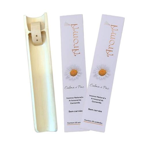 Composição do Kit: - 2 Caixas de Incensos Naturais de Camomila Aromá com 10 varetas de 24 cm cada total 20 incensos - 1 Incensário de Bambú Duplo Artesanal Aromá Envernizado calma e Paz Transforme seu ambiente com o Incenso Natural e Artesanal de Camomila da Aromá, transmite relaxamento e acolhimento. Desfrute de um momento de paz e tranquilidade com o nosso incenso natural e artesanal de camomila. Elaborado com ingredientes cuidadosamente selecionados, este incenso proporciona um aroma suave e relaxante, ideal para criar uma atmosfera acolhedora e harmoniosa em sua casa ou espaço de trabalho. Benefícios: natural: A camomila é conhecida por suas propriedades calmantes, que ajudam a reduzir o e a ansiedade, promovendo o relaxamento e o bem-estar. Ingredientes naturais: Nosso incenso é feito com ingredientes naturais de alta qualidade, como flores de camomila, óleos essenciais e resinas vegetais, que garantem um aroma puro e autêntico. Artesanal: Cada incenso é cuidadosamente feito à mão, o que garante um produto único e especial, perfeito para quem aprecia a beleza dos produtos artesanais. Sem carvão: não gera fumaça preta durante a queima Duração: Cada vareta de incenso queima por aproximadamente 50 minutos, proporcionando um aroma relaxante por mais tempo. Versátil: Ideal para diversos ambientes, como salas de estar, quartos, escritórios, espaços de meditação e yoga, ou onde mais desejar criar um ambiente relaxante e acolhedor. Modo de usar: Acenda a ponta do incenso e espere alguns segundos até que a chama se apague, deixando apenas a brasa. Coloque o incenso no incensário de bambú Aromá em um local seguro e arejado e longe de madeiras e tecidos ou outras substâncias combustíveis ou inflamáveis. Desfrute do aroma relaxante da camomila e deixe o ambiente mais tranquilo e acolhedor. Precauções: Mantenha o incenso longe de crianças e animais de estimação. Não deixe o incenso aceso sem supervisão. Utilize o incensário em uma superfície resistente ao calor. Adquira agora o seu incenso natural e artesanal de camomila e transforme seus momentos de descanso em momentos de puro relaxamento e bem-estar. Observação: por ser um produto artesanal, pode ocorrer variação no aspecto do produto. Incensário Duplo de Bambú Artesanal Envernizado 23 cm Aromá Conheça o incensário duplo artesanal de bambu envernizado da Aromá, uma peça única e elegante para quem aprecia a arte da queima de incensos. Feito à mão com bambu natural, este incensário é perfeito para quem busca um toque de sofisticação e praticidade. Características: Design exclusivo: Com capacidade para dois incensos, este incensário permite que você combine diferentes aromas e desfrute de uma experiência olfativa personalizada. Artesanal: Cada peça é cuidadosamente trabalhada por artesãos, garantindo um produto único e de alta qualidade. Bambu natural: O bambu utilizado é proveniente de fontes sustentáveis, um material leve e resistente. Envernizado: O acabamento envernizado confere maior durabilidade e um brilho elegante à peça. Versátil: Ideal para diversos ambientes, como salas de estar, quartos, escritórios e espaços de meditação. Benefícios: Praticidade: Queime seus incensos de forma organizada e segura, sem se preocupar com resíduos, por ter a canaleta alta e curva tipo meia-cana ele recolhe as cinzas que caem, diferentemente dos incensários retos. Relaxamento: Desfrute de momentos de paz e tranquilidade com a queima de seus incensos favoritos. Especificações: Material: Bambu natural Capacidade: 2 incensos Acabamento: Envernizado Dimensões aproximadas: 23cm de comprimento x 4 cm de largura x 2,5 cm de altura Peso aproximado: 50 a 80 g Cuidados: Limpar com pano úmido e sabão neutro. Não utilizar produtos abrasivos ou químicos. Evitar contato com água em excesso. Observações: Por se tratar de um produto artesanal, pequenas variações podem ocorrer.