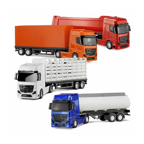 Vem com a versão Tanque, Caçamba, Baú e Haras, 4 versões de veículos roda livre para brincar e colecionar!