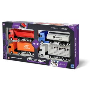 Contém: 1 caminhão haras com carreta e 3 cavalos, 1 caminhão tanque, 1 caminhão caçamba e 1 caminhão baú.