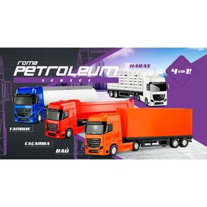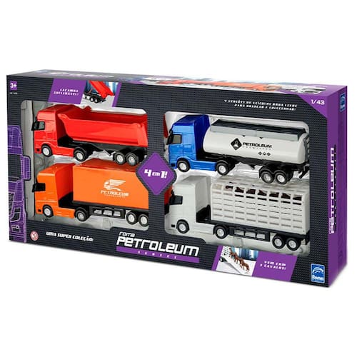 Kit Caminhões Roda Livre - Petroleum Series - 4 em 1 - Roma Brinquedos: Uma super coleção de caminhões carreta de brinquedo para fazer a alegria dos pequenos! Esse kit com 4 caminhões altamente detalhados traz os grandes sucessos da linha Roma Petroleum: Haras, Tanque, Caçamba e Baú. Detalhes: • Todos os caminhões tem rodinhas livres • Inspirados em caminhões de verdade • O Caminhão Petroleum Haras vem com 3 cavalinhos em miniatura • O Caminhão Petroleum Caçamba tem caçambas articuladas para descarregar a carga pela tampa traseira Informações: • Produto: Kit de Caminhões Petroleum • Marca: Roma Brinquedos • Coleção: Roma Petroleum Series • Tipo: Conjunto com Caminhões de Brinquedo • Categoria: Carrinhos e Cia • Tamanho (C x A x L): 42 x 09 x 6.5 cm • Volume (Peso): 0.216 kg • Conteúdo: 4 Caminhões Petroleum - 01 Petroleum Tanque - 01 Petroleum Baú - 01 Petroleum Caçamba - 01 Petroleum Haras com 3 Cavalinhos • Recomendação: para crianças a partir de 03 anos de idade Especificações: • Referência: 1476 • Código de Barras: 7896965214766 • Embalagem (C x A x L): 49.5 x 16.5 x 8.5 cm • Embalagem (Peso): 0.420 kg • Material / Composição: Plástico • Registro: 003091/2019 - OCP 0003 • Certificado: Órgãos Autorizados - OCP´S (Organismos de Certificação de Produtos) Benefícios de brincar: • Eleva a autoestima • Exercita a memória • Estimula o raciocínio • Exercita o imaginário • Desenvolve a criatividade • Desenvolve percepção visual • Desperta a atenção e curiosidade • Desenvolvimento neuropsicológico • Estimula habilidades motoras básicas • Incentiva a comunicação e linguagem • Desenvolve aspectos emocionais e afetivo • Estimula o reconhecimento de formas e cores Aviso: • As imagens são meramente ilustrativas • Os pesos, tamanhos e medidas são aproximados • As cores e estampas dos produtos podem ter variações • As informações são de responsabilidade do fabricante ou fornecedor Ean: 7896965214766