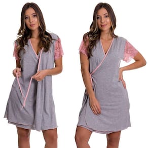 Camisola amamentação com robe cinza em viscolycra e renda, camisola azul marinho é confeccionada em microfibra.
