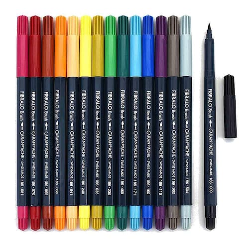 Canetas hidrossolúveis com ponta de pincel que permitem experimentação e linhas dinâmicas. ampla variedade de cores artísticas e ultra-brilhantes complementares à coleção Fibralo. aplicações:a caneta com ponta de fibra ideal para colorir, desenhar, caligrafia, quadrinhos, esboços dinâmicos, etc.Descrição técnica :Tipo: Canetas hidrossolúveis com ponta de pincel, que podem criar linhas variadas de 0,5 a 5 mm de espessuraTinta à base de água de qualidade superior não penetra no papel e pode ser lavada na maioria dos tecidos modernosCores à base de corantes alimentares, brilhantes e transparentes, longa vida 700 m Técnicas: aquarela, lavagens, stencilling, técnica de empacotamento de cores, desenho, coloração e impressão por transferência.Desenvolvido e fabricado na Suíça. Kit contendo as cores: Preta, Laranja, Mostarda, Marrom, Vermelha, Rosa, Violeta, Azul Escuro, Azul Claro, Verde Claro, Verde Escuro, Amarela, Cinza Frio, Amarelo Pele, Cinza Quente