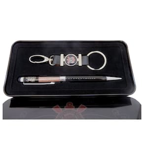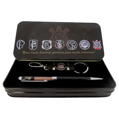 Acompanha um chaveiro com o escudo do Corinthians todo feito em material resistente e de longa vida útil. Tanto a Caneta quanto o Chaveiro são nas cores oficiais do time. Acompanham um bonito estojo para quem quiser colecionar e guardar apenas para admiração de seus itens do time.