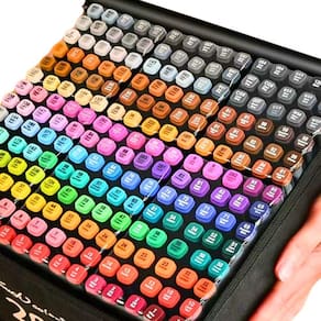 Cada marcador possui ponta dupla, sendo uma ponta fina para detalhes precisos e uma ponta chanfrada para preenchimentos e sombreamentos, permitindo criar traços de diferentes espessuras. As pontas utilizam um único reservatório de tinta, garantindo uma combinação perfeita de cores e consistência durante o uso.