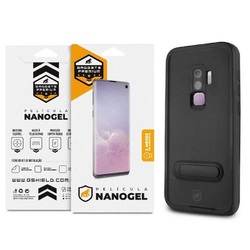 Kit com capa à prova d'água e película Nano Gel dupla. A película cobre todo o visor, adaptando-se às extremidades curvadas. Inclui película reserva. Garantia vitalícia co-participativa para reposição da película.Tipo