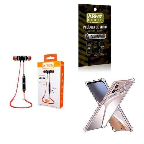 Kit Capinha Moto E23 AntiShock Transparente + Fone de Ouvido Sem fio KD901 + Película de Vidro 3D Frontal