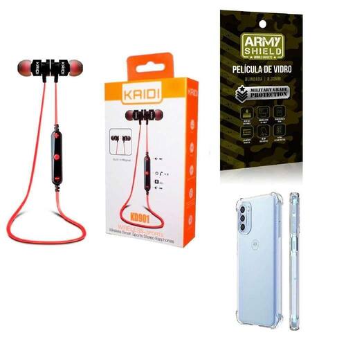 Fone de Ouvido Esportivo sem fio KD-901Se você procura um fone para as atividades diárias, exercícios e movimento o fone sem fio KD-901 é a escolha idealContém Tons graves , profundos e complexos. Um verdadeiro som de qualidadeControle a reprodução de músicas e vídeos direto do botão de controle.Atenda e desligue chamadas, microfone HD in line embutido com controle de faixas.Com imã embutido que não atrapalha e não fica caindo da orelha, produto de design intra-auricular projetado para ser confortável ao ouvido. Isolamento de ruídos sem vazamento de som. O fone utiliza uma tecnologia aeronáutica de redução de ruído. Isola interferência de ruído externo. Mergulhe no mundo da músicaEspecificaçãoVersão: V4.2Tempo de espera: 200hTempo de conversação: 6hTempo de reprodução de música: 4hTempo de carregamento: 1.5hFaixa de frequência: 2.402G-2.480GTemperatura ambiente: -20/ +60CDistância de transmissão: 10mEspecificação do DriverUnidade do driver: 10mmSensibilidade: 103dB +-3dBImpedância: 16 +- 15%Resposta de frequência: 20-20000HzComprimento do cabo: 600mm Conteúdo da Embalagem:1und - Fone de Ouvido Esportivo sem fio com microfone HD Atenção: Não acompanha itens não descritos neste anúncio.-------------Capinha Silicone Anti Impacto Anti Shock Transparente - ArmyshieldA capa de celular antishock é um produto de alta qualidade que oferece proteção e estilo para o seu dispositivo móvel. Feita de material de TPU poliuretano termoplástico de alta resistência, a capa é projetada para absorver impactos e proteger o seu celular contra quedas, arranhões e outros danos.A capa antishock transparente é especialmente projetada para se encaixar perfeitamente no seu celular, proporcionando uma cobertura completa e proteção para todas as partes do dispositivo. Ela é transparente, permitindo que você exiba a beleza do seu celular sem comprometer a proteção.-------------Película de Vidro 3D Blindada - ArmyshieldA película de vidro 3D para celular é um produto de alta qualidade que oferece proteção e estilo para o seu dispositivo móvel. Feita de vidro temperado de alta resistência, a película é projetada para se encaixar perfeitamente na tela do seu celular, proporcionando uma cobertura completa e proteção contra arranhões, rachaduras e outros danos.A película de vidro 3D é especialmente projetada para se curvar suavemente ao redor das bordas do seu celular, criando uma aparência elegante e sem bordas. Isso significa que você pode desfrutar de uma experiência de visualização imersiva e sem interrupções, sem se preocupar com a película descolando ou interferindo na sensibilidade da tela.Atenção: O produto acompanha apenas o que apresenta na imagem.