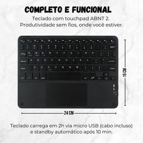 Kit capa pasta tpu + teclado touchpad para tablet s7 fe t735 Cor: preto Transforme seu tablet em uma solução prática para estudo, trabalho e lazer com este kit 2 em 1, pensado para quem busca mobilidade e conforto no dia a dia. O kit é composto por case bag em silicone, teclado bluetooth com touchpad, permitindo digitar, navegar e usar o tablet com muito mais eficiência, sem depender da tela touch o tempo todo. Ideal para quem precisa de produtividade em qualquer lugar, o teclado com touchpad oferece navegação semelhante à de um notebook, o mouse garante mais precisão e a case bag em silicone protege o tablet contra riscos, poeira e pequenos impactos do uso diário. Adquira agora seu kit completo e leve mais praticidade, ergonomia e produtividade para o seu dia a dia. Compatível com ipads, tablets android, windows e muito mais ------------------ ------------------ O teclado e o mouse funcionam é universal R: sim o kit é compatível com ipads, tablets android, windows e qualquer dispositivo com bluetooth. Precisa de aplicativo ou cabo para usar R: não basta ligar o teclado e o mouse, ativar o bluetooth do seu dispositivo e conectar. É simples, rápido e sem fios. Como faço para conectar o teclado e o mouse Ligue o botão on no teclado e no mouse. - no teclado, pressione fn + c para ativar o modo pareamento. - no seu dispositivo, ative o bluetooth e conecte aos nomes bluetooth keyboard e bluetooth mouse. Funciona com celular também R: sim, desde que o celular tenha bluetooth e suporte a dispositivos de entrada como teclado e mouse . Ideal para produtividade e praticidade ------------------ Especificações ------------------ Teclado touchpad bluetooth: Conexão: bluetooth 3.0 ou superior Alcance: até 10 metros Teclas: silenciosas e macias Ativação do bluetooth: fn + c Alimentação: via cabo usb cabo incluso Compatibilidade: ios, android, windows, ipados ------------------ Conteúdo ------------------ 1x case silicone. 1x teclado touchpad bluetooth. 1x cabo usb para recarga. 1x manual de instruções. Anúncio referente à capa silicone + teclado Acessórios que ambientam as fotos não inclusos. ------------------ Apresentação: ------------------ - qualidade garantida. - atendimento qualificado. - enviamos para todo o brasil. - compra garantida. - despachamos em até 1 dia útil após confirmação do pagamento Garantimos a devolução por arrependimento em até 7 dias, após o recebimento e de 15 dias contra defeitos de fabricação.