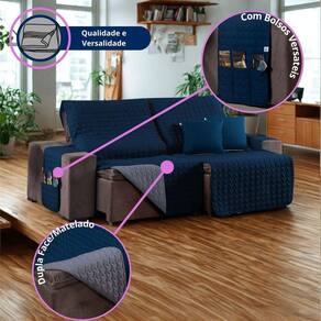 Kit Capa Protetora Sofá Retrátil 2,20m Shield Dupla Face + Almofadas Variação: Azul Marinho e Cinza Bem-vindo a à Atual Ecommerce - há mais de 4 anos oferecendo conforto e estilo para o seu lar Se você busca proteger seu sofá retrátil com sofisticação e praticidade, o Kit Capa Protetora de Sofá Retrátil Shield 2,20m Dupla Face com Almofadas é a escolha perfeita. Feito com tecido resistente, design moderno e caimento impecável, ele transforma sua sala com elegância. Seu sofá merece proteção e beleza em um só produto. Manchas, pelos, sujeiras e desgaste são desafios do dia a dia - especialmente com pets ou crianças. Com o Protetor Shield, você preserva a aparência do seu sofá e ainda renova a decoração da sua casa. Com dupla face e almofadas inclusas, o visual da sala muda conforme seu gosto. O que dizem nossos clientes satisfeitos: protege e valoriza o sofá. A cor dupla face me permite variar sempre. muito bonito e de ótima qualidade. Meu sofá parece novo. fácil de colocar e os bolsos são muito úteis para o controle e celular. Especificações Técnicas: Modelo: Shield Retrátil com Almofadas Para sofás retráteis com assento de até 2,20 metros Medidas Aproximadas: 2 partes de 1,10m x 2,40m assento retrátil 2 braços: 50cm x 90cm cada Medida total com os braços: 4,00m x 2,40m 2 Capas de Almofada: 45cm x 45cm Material: Tecido superior/inferior: 100% Poliéster - Hipercal 400 Fios Enchimento: 100% Poliéster Acabamento em viés e amarras para fixação Extras: Bolsos laterais funcionais Design: Matelado e Dupla Face Produto com 3 meses de contra defeitos de fabricação. Compre com tranquilidade e segurança Proteja, renove e transforme seu sofá com o Kit Shield. Estoques limitados Garanta o seu agora e valorize o ambiente da sua casa com um produto funcional, elegante e de qualidade superior. Agradecemos sua visita à Atual Ecommerce. Conte com a gente para cuidar do seu lar com carinho