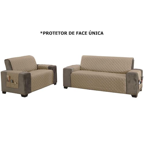 Contém na embalagem: 1 Protetor face única para sofá de 2 lugares com medidas: Capa: 1,10m larg x 1,90m alt/Braços: 80cm comp x 40cm larg - Porta objetos no braço do lado direito - Medida total: 2,70m larg x 1,90m alt
