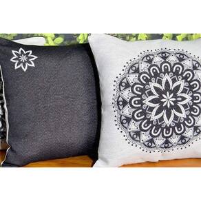 Linda capa de almofada em tecido jacquard rústico dupla face, em tons de cinza e preto, com detalhes em desenhos em flores e fecho em ziper em uma das laterais.