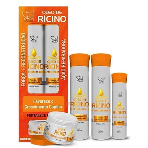 O Kit Capilar Óleo de Rícino Soul Cosméticos é a escolha ideal para quem deseja cabelos mais fortes, hidratados e com brilho intenso. Composto por quatro produtos poderosos ? Shampoo, Condicionador, Máscara Capilar e Leave-In, todos formulados com óleo de rícino, um ingrediente natural altamente eficaz para fortalecer os fios, promover o crescimento saudável e prevenir a queda. Este kit é adequado para todos os tipos de cabelo, oferecendo uma experiência de cuidado completa e profunda.