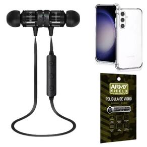 Proteja seu Galaxy A15 com este kit completo Inclui uma capinha anti-choque, fone Bluetooth bass potente modelo HS-514 e uma película de vidro 3D da ArmyShield para uma proteção completa e estilo moderno.