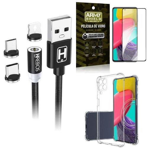 Kit Capinha Silicone Transparente anti shock com bordas reforçadas + Película de Vidro 3D Blindada ArmyShield + Cabo Magnetico de 2 metros com 3 pontas.