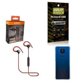 Fone de Ouvido Esportivo sem fio Magnético e com gancho para esportes KD-904 Se você procura um fone para as atividades diárias, exercícios e movimento o fone sem fio KD-904 é a escolha ideal Contém Tons graves , profundos e complexos. Um verdadeiro som de qualidade Controle a reprodução de músicas e vídeos direto do botão de controle. Atenda e desligue chamadas, microfone HD in line embutido com controle de faixas. Com imã embutido que não atrapalha e não fica caindo da orelha, produto de design intra-auricular projetado para ser confortável ao ouvido. Isolamento de ruídos sem vazamento de som. O fone utiliza uma tecnologia aeronáutica de redução de ruído. Isola interferência de ruído externo. Mergulhe no mundo da música Especificação Versão: V5.0 Tempo de espera: 200h Tempo de conversação: 6h Tempo de reprodução de música: 5h Tempo de carregamento: 1h Frequências RF: 2,4GHz Faixa de frequência: 2.402G-2.480G Temperatura ambiente: -20/ +60C Distância de transmissão: 10m Especificação do Driver Unidade do driver: 10mm Sensibilidade: 90dB +-3dB Impedância: 32 +- 15% Resposta de frequência: 20-20000Hz Comprimento do cabo: 600mm ----- Película de Vidro 3D Blindada - Armyshield Com Kit de Instalação A película de vidro 3D para celular é um produto de alta qualidade que oferece proteção e estilo para o seu dispositivo móvel. Feita de vidro temperado de alta resistência, a película é projetada para se encaixar perfeitamente na tela do seu celular, proporcionando uma cobertura completa e proteção contra arranhões, rachaduras e outros danos. ------- Capinha Silicone Anti Impacto Anti Shock Transparente - Armyshield A capa de celular antishock é um produto de alta qualidade que oferece proteção e estilo para o seu dispositivo móvel. Feita de material de TPU poliuretano termoplástico de alta resistência, a capa é projetada para absorver impactos e proteger o seu celular contra quedas, arranhões e outros danos. Somos especialistas em Acessórios para celular há mais de 7 anos Antes de comprar verifique se o modelo do seu celular é o mesmo do produto comprado. Agradecemos a Preferência