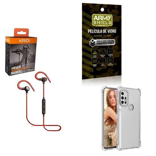 Fone de Ouvido Esportivo sem fio Magnético e com gancho para esportes KD-904Se você procura um fone para as atividades diárias, exercícios e movimento o fone sem fio KD-904 é a escolha idealContém Tons graves , profundos e complexos. Um verdadeiro som de qualidadeControle a reprodução de músicas e vídeos direto do botão de controle.Atenda e desligue chamadas, microfone HD in line embutido com controle de faixas.Com imã embutido que não atrapalha e não fica caindo da orelha, produto de design intra-auricular projetado para ser confortável ao ouvido.Isolamento de ruídos sem vazamento de som. O fone utiliza uma tecnologia aeronáutica de redução de ruído. Isola interferência de ruído externo. Mergulhe no mundo da músicaEspecificaçãoVersão: V5.0Tempo de espera: 200hTempo de conversação: 6hTempo de reprodução de música: 5hTempo de carregamento: 1hFrequências RF: 2,4GHzFaixa de frequência: 2.402G-2.480GTemperatura ambiente: -20/ +60CDistância de transmissão: 10mEspecificação do DriverUnidade do driver: 10mmSensibilidade: 90dB +-3dBImpedância: 32 +- 15%Resposta de frequência: 20-20000HzComprimento do cabo: 600mm-----Película de Vidro 3D Blindada - Armyshield Com Kit de InstalaçãoA película de vidro 3D para celular é um produto de alta qualidade que oferece proteção e estilo para o seu dispositivo móvel. Feita de vidro temperado de alta resistência, a película é projetada para se encaixar perfeitamente na tela do seu celular, proporcionando uma cobertura completa e proteção contra arranhões, rachaduras e outros danos. ------- Capinha Silicone Anti Impacto Anti Shock Transparente - ArmyshieldA capa de celular antishock é um produto de alta qualidade que oferece proteção e estilo para o seu dispositivo móvel. Feita de material de TPU poliuretano termoplástico de alta resistência, a capa é projetada para absorver impactos e proteger o seu celular contra quedas, arranhões e outros danos.Somos especialistas em Acessórios para celular há mais de 7 anos Antes de comprar verifique se o modelo do seu celular é o mesmo do produto comprado. Agradecemos a Preferência