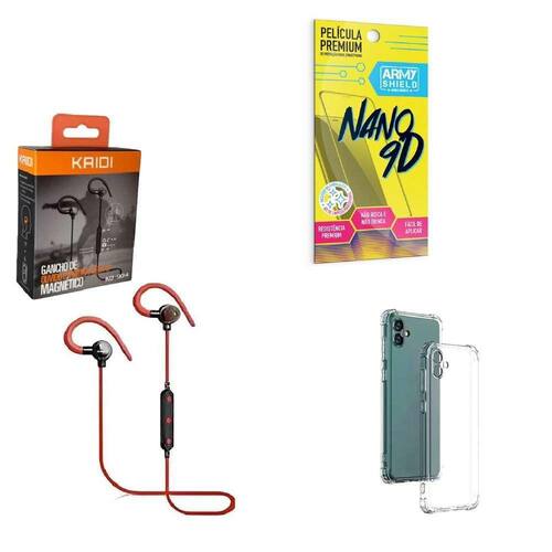 Fone de Ouvido Esportivo sem fio Magnético e com gancho para esportes KD-904Se você procura um fone para as atividades diárias, exercícios e movimento o fone sem fio KD-904 é a escolha idealContém Tons graves , profundos e complexos. Um verdadeiro som de qualidadeControle a reprodução de músicas e vídeos direto do botão de controle.Atenda e desligue chamadas, microfone HD in line embutido com controle de faixas.Com imã embutido que não atrapalha e não fica caindo da orelha, produto de design intra-auricular projetado para ser confortável ao ouvido.Isolamento de ruídos sem vazamento de som. O fone utiliza uma tecnologia aeronáutica de redução de ruído. Isola interferência de ruído externo. Mergulhe no mundo da músicaEspecificaçãoVersão: V5.0Tempo de espera: 200hTempo de conversação: 6hTempo de reprodução de música: 5hTempo de carregamento: 1hFrequências RF: 2,4GHzFaixa de frequência: 2.402G-2.480GTemperatura ambiente: -20/ +60CDistância de transmissão: 10mEspecificação do DriverUnidade do driver: 10mmSensibilidade: 90dB +-3dBImpedância: 32 +- 15%Resposta de frequência: 20-20000HzComprimento do cabo: 600mm-----Película Nano Cerâmica 9D com kit instalaçãoPelícula Nano Cerâmica 9D com Bordas Pretas cobre 100% da tela - Película Flexível não trinca com o uso e nem quebra - Fácil Aplicação - Proteção Avançada contra Riscos e Quedas - Dura até 5x mais que as Películas de Vidro Alguns modelos de Películas possuem um leve recuo para que a mesma não saia com o uso da Capinha Somos especialistas em Acessórios para celular há mais de 7 anos Antes de comprar verifique se o modelo do seu celular é o mesmo do produto comprado. Agradecemos a Preferência ------- Capinha Silicone Anti Impacto Anti Shock Transparente - ArmyshieldA capa de celular antishock é um produto de alta qualidade que oferece proteção e estilo para o seu dispositivo móvel. Feita de material de TPU poliuretano termoplástico de alta resistência, a capa é projetada para absorver impactos e proteger o seu celular contra quedas, arranhões e outros danos.Somos especialistas em Acessórios para celular há mais de 7 anos Antes de comprar verifique se o modelo do seu celular é o mesmo do produto comprado. Agradecemos a Preferência