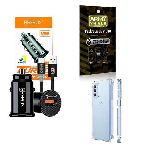 Carregador veicular turbo com certificação Anatel, película 3D blindada com kit de instalação e capinha de silicone anti-impacto transparente.Características