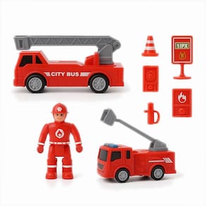 Kit Carrinhos de Bombeiro Fricção Com Acessórios de Trânsito Placas Cones Posto Kit 13 Pçs.