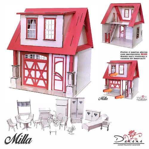 Casa de bonecas modelo milla - darama Um dos nossos lançamentos de 2022, a casa de bonecas milla, tras um conceito mais compacto para casinhas de escala para bonecas de 30 cm de altura, ideal para pequenos espaços. A casa modelo milla possui dimensão total de 60 cm de comprimentos por 56 centimetros de profundidade, e 70 centimetros de altura, comportando bonecas de até 30 cm de altura como as da linha barbie e similares. Ela é composta por 2 cômodos amplos, sendo ambos de 35 cm de altura. Possui ainda uma varanda na parte frontal com espaçamento de 10 cm, ideal para que sua boneca possa circular tranquilamente na parte interna. As janelas e portas deste modelo são móveis, ou seja, as janelas e as portinhas abrem e fecham, dando mais realismo ao produto. Todo o produto é enviado desmontado, e para sua montagem disponibilizamos um manual ilustrativo. A montagem é feita através de encaixes e colagem precisa seguir o tutorial de montagem sendo um desafio para toda a família a construção desta linda casinha. A casinha milla está sendo comercializada em diversas versões, tanto coloridas, como em mdf natural.