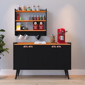 Pensando em deixar seu lar ainda mais aconchegante e organizado, a RPM Móveis elaborou o conjunto Aparador Buffet Kiev com o Armário Suspenso Amélia. O Buffet Kiev conta com 2 prateleiras internas, 4 portas e um amplo tampo, perfeitos para organizar itens de cozinha e montar seu cantinho do café. Já o Armário Amélia conta com 2 prateleiras e 5 ganchos organizadores, ideais para pendurar canecas, xícaras, panos de prato e muito mais. Esse kit é composto por produtos exclusivos e de excelente qualidade que darão ao seu ambiente um toque de elegância e requinte.