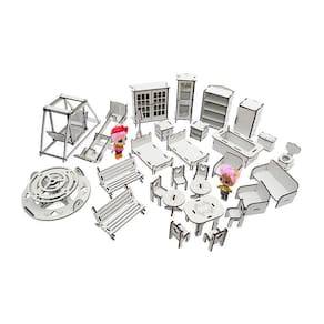 Confeccionada em mdf de 3 mm,a casinha de bonecas é compostapor diversas peças,as quais se encaixam sutilmente devido a precisão de cortedos mesmos. Acompanha móveis.