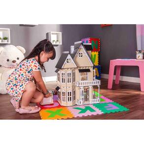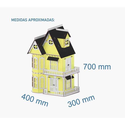 Confeccionada em mdf de 3 mm,a casinha de bonecas é compostapor diversas peças,as quais se encaixam sutilmente devido a precisão de cortedos mesmos. Acompanha móveis.