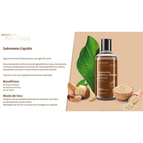 Kit Extratos da Natureza Castanhas Nobres e Quinoa Fragância Sofisticada, hidratação para pele seca. Sabonete Líquido : Age promovendo limpeza suave, sem agredir a pele. Sua composição confere sensorial agradável ao toque, tem espuma Cremosa, enriquecida com extrato de Castanhas Nobres e Quinoa, Que ajudam a prevenir o ressecamento excessivo da pele. Tudo isso com uma fragrância envolvente e delicada. Benefícios: Limpa e Hidrata Espuma Cremosa Uso diário