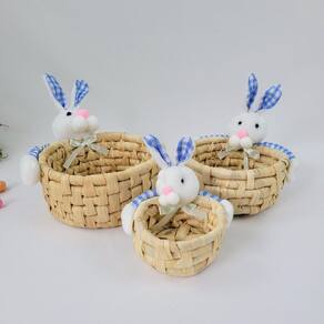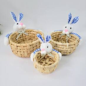 design Natural e Elegante: Cada cesta é feita de fibra natural, proporcionando um visual rústico e sofisticado. adornos Delicados: Coelhos em tecido conferem um charme único às cestas, tornando-as ideais para uma decoração temática de Páscoa. variedade de Tamanhos: Possibilita diferentes usos na mesa posta, desde servir pães e biscoitos até guardar guardanapos ou pequenos arranjos.