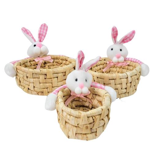 Transforme sua mesa posta nesta Páscoa com a elegância e encanto do nosso conjunto de 3 cestas de fibra natural, adornadas com coelhos em tecido. Perfeitas para servir aperitivos com um toque especial