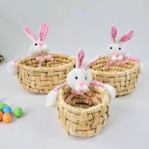 Decore e Sirva com Charme: Nosso conjunto de cestas de fibra natural com coelhos em tecido é a escolha perfeita para quem valoriza beleza e funcionalidade.