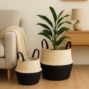 Este kit de cestos é confeccionado em algodão e fibra natural, com design moderno em duas cores, ideal para decorar e manter seus ambientes organizados. Versáteis e dobráveis, podem ser utilizados para guardar mantas, brinquedos, roupas, vasos de plantas e muito mais, adicionando charme e praticidade à sua casa.