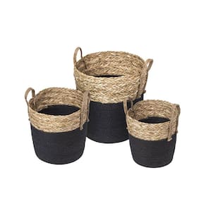 Kit de 3 Cestos Patong Fibra Natural Preto, conta com 3 cestos de tamanhos decrescentes de fibra natural.