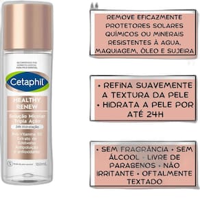 Apresentamos a Solução Micelar Hidratante Tripla Ação Cetaphil Healthy Renew, formulada com extrato de Edelweiss, extrato de Arroz, Vitamina B5, Glicerina e Pantenol, que remove eficazmente protetores solares químicos ou minerais resistentes à agua, maquiagem, óleo e sujeira, e deixa a pele purificada e desintoxicada, ao mesmo tempo que melhora a luminosidade, elasticidade, hidratação e resistência da pele.