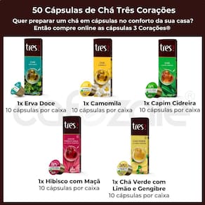 Este kit contém 5 caixas de 10 cápsulas Três Corações, totalizando 50 cápsulas. Cada cápsula possui dosagem para 100ml de chá e é 100% natural, sem açúcar.