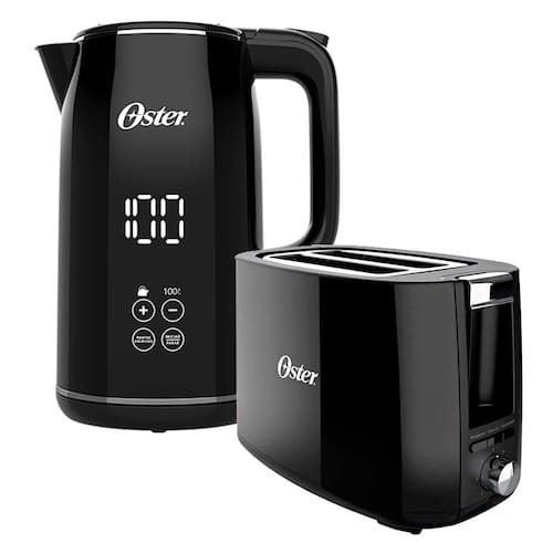 Kit Oster contendo chaleira digital 1.7L com controle de temperatura, função anti-dry, desligamento automático, painel touch, função manter aquecido e torradeira com 7 níveis de tostagem e funções cancelar, descongelar e reaquecer.Vendido e entregue por Oster