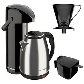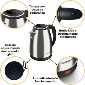 Kit chaleira jarra elétrica 1,8l 1 garrafa térmica preta 1l Chaleira elétrica unitermi atacama inox 110v 1.8l + garrafa térmica 1l verona + açucareiro + filtro café Chaleira elétrica atacama inox 110v 1.8l - se o que deseja é mais praticidade na hora de esquentarágua paraum delicioso café, chá ou chimarrão, essa chaleira foi feitapara isso - esquentaa água em menos de 5 minutos, essencialna correria dodia a dia; - acabamento de excelente qualidadeem inox, não enferruja; - superfície lisa e polida, fácil limpeza; - design moderno e elegante; - ocorpo da garrafa é espelhado, trazendo ainda mais beleza; - tampa com trava de segurança eluz indicadora de funcionamento; - fácil manuseio. Após apertar o botão para ligar, o desligamento é automático; - base de aquecimento destacável em 360, mais facilidade; - capacidade: 1,8l; - potência: 1200w; - tensão: 127v; - frequência: 5060hz; - corrente: 10.9a; - material: aço inoxidável e pp. Garrafa térmica 1l verona - com alça quefacilitao momento de carregá-la;- higiene fácil devido a sua superfície lisa e por ser desmontável; - sistema de pressão para se servir, além de bico anti-pingo para evitar possíveis vazamentos e a entrada de poeira e insetos; - eficiência térmica: 12 horas frio e 8 horas quente; - possui alça que facilita o manuseio e transporte; - bico anti gotas; - livre de bpa; - capacidade: 1l; - peso: 640g; - material do exterior da garrafa: tampa e demais peças em plástico injetado; - material do interior da garrafa: ampola de vidro; - altura garrafa com tampa: 31,5 cm; - largura da garrafa: 11 cm; - largura da tampa: 14 cm; Obs: o teste para verificação de funcionamento correto da garrafa deve ser feito somente com água, para não danificar a integridade do produto em caso de necessidade de troca. Não aceitaremos devoluções após o uso com café. Itens inclusos: - 1x chaleira jarra elétrica 110v de inox 1,8l unitermi - 1x garrafa térmica 1l unitermi verona preto - 1x filtro suporte para café - 1x açucareiro 350ml