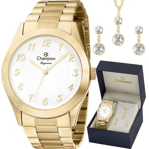 Relógio CHAMPION KIT Elegance feminino dourado CN26484W - Gênero: Feminino - : 12 Meses Características - Composição do Vidro: Cristal Mineral - Material da Caixa: Metal - Cor da Caixa: Dourado - Material da Pulseira: Aço Inox - Cor da Pulseira: Dourado Medidas - Diâmetro da Caixa: 42 mm - Espessura da Caixa: 10 mm Resistência a Água - Pressão: 5 ATM - Pode Lavar as Mãos: Sim - Pode Usar em Água Corrente: Sim - Pode Usar na Piscina: Não Ean: 7891511349190
