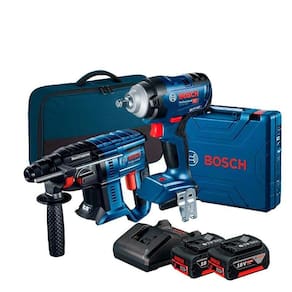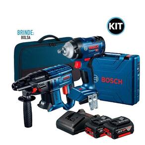 Kit Chave de Impacto 1/2 18v GDS 18V-400 e Martelete Bosch 18V GBH180-LI + Kit 2 Baterias 4Ah 18V e Carregador Bivolt Chave de Impacto 1/2 Bateria 18v Bosch GDS18V-400: A Chave de Impacto Bosch gds 18V-400 possui alto torque de 400Nm de Aperto e 600nm de Desaperto conta com motor Brushless sem escovas de carvão, livre de manutenção, com o dobro de vida útil.Essa ferramenta é robusta, com mancal de alumínio para trabalhos em condições severas.A Chave de Impacto Bosch gds 18V-400 possui uma nova tecnologia em Chaves de Impacto chamada ABR - Auto Bolt Release ou Liberação automática do parafuso, que aumenta a produtividade da ferramenta durante aplicações de desmontagem, garantindo que a ferramenta pare automaticamente de funcionar quando as porcas já estiverem afrouxadas; evitando assim, a queda das porcas e parafusos.Ferramenta 100% compatível com todas as baterias e carregadores Bosch 18V Peso sem bateria: 1,25 kgTorque, máx.: 400 NmNº de rotações em vazio: 0-2.500 r. P. M.Suporte da ferramenta: 1/2'' QuadradoNº de rotações em vazio 1º nível : 0-0 r. P. M.Nº de rotações em vazio 2º nível : 0-0 r. P. M.Nº de rotações em vazio 3º nível : 0-0 r. P. M.Número máx. De impactos: 0-3.700 i. P. M.Torque de arranque, máx.: 600 NmDo parafuso: M 10 - M 20Valor de emissão de vibrações ah: 10 m/sIncerteza k: 1,5 m/s Martelete Rotativo Rompedor SDS A Bateria 18V GBH 180-Li Bosch Alta performance: 20% mais furos do que sua versão anterior.Melhor custo-benefício do mercado com motor sem escovas de carvão.Velocidade variável para maior controle nas aplicações.Embreagem de segurança para maior proteção do usuário em caso de sobrecarga da ferramenta. Características:Ideal para ser utilizado na construção, trabalhos profissionais em construções, reformas e instalações em geral.Possui sistema de troca rápida de acessórios SDS-Plus, e proporciona 20% mais furos do sua versão anterior.Vem com motor sem escovas de carvão livre de manutenção, com o dobro de vida útil e maior autonomia.Além disso vem com Luz de led, para trabalhar em áreas menos iluminadas. -Velocidade variável para maior controle nas aplicações.Embreagem de segurança para maior proteção do usuário em caso de sobrecarga da ferramenta.Controle de torque: não.Vibração m/s , perfuração: 12,6 m/s.Energia de impacto máxima: 2 J.Número de impactos por minuto : 0 - 5.100 ipm.Velocidade nominal de rotação: 0 - 1.800 rpm.Encaixe: SDS plus.Diâmetro de perfuração em metal: 13 mm.Diâmetro de perfuração em madeira: 30 mm.Diâmetro de perfuração em concreto: 20 mm. Kit 2 Baterias 4A e Carregador GAL18V-20 18v Bivolt Bosch 1600A019CJ: Com o Kit Carregador e 2 Baterias 18V 4Ah Freedom Concept da Bosch o trabalho pode ser contínuo graças à elevada capacidade da bateria, que possui 4,0 Ah de autonomia em combinação com um carregador bi-volt.Sistema profissional 18V, essas baterias e o carregador podem ser usados com todas as ferramentas de 18 V da Bosch.O design exclusivo COOLPACK aumenta a vida útil da bateria, pois sua a carcaça especial reduz o acumulo de calor no interior da bateria. Especificações:Marca: BoschModelo: Freedom ConceptCapacidade da bateria: 4.0ahTensão Bateria: 18VTempo de Carga: 160/210 min aproximadamentePeso: 1.50kgVoltagem de Carga da Bateria: 14,4 - 18V Itens Inclusos no Kit:01 - Chave de Impacto 1/2 Bateria 18v Bosch GDS18V-400;01 - Martelete Rotativo Rompedor SDS GBH 180-Li Bosch ;01 - Manual de instruções;01 - Limitador de profundidade;01 - Punho auxiliar;02 - Baterias GBA 18V 4.0ah;01 - Carregador GAL 18V-20 Professional Bivolt;01 - Bolsa Bosch Imagem Meramente Ilustrativa