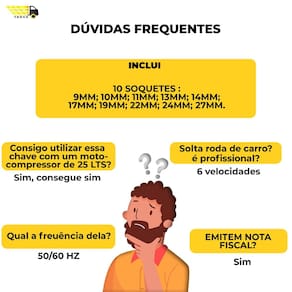Kit chave de impacto pneumática 1/2 32kgf 17 peças Truck ponto com Nossa equipe de atendimento está sempre pronta para te atender da melhor forma possivel. Emitimos para empresas e pessoa fisica - produto com de fabrica contra defeitos de fabricaçao Kit chave de impacto pneumática 1/2 32kgf 17 peças rotta 376 é uma ferramenta utilizada para apertar e soltar porcas de segurança. Este tipo de ferramenta foi desenvolvido especialmente para proporcionar a máxima transmissão da energia de impacto para a porca sendo muito útil para a manipulação de parafusos oxidados, entre outras utilizações. Aplicação: serviço de manutenção geral para todos os tipos de indústrias, oficinas e concessionárias. Rotação máxima de 7.000 rpm reversivél 4 velocidades de torque 1,2,3 e 4 Sistema de reversão com pino Kit completo com chave allen, extensão, 10 soquetes, mini lubrifil, bisnaga de óleo, engate rápido e maleta. Dados técnicos: Modelo: 700532 Mecanismo twin hammer 10 soquetes : 9mm; 10mm; 11mm; 13mm; 14mm; 17mm; 19mm; 22mm; 24mm; 27mm. Rotação máxima: 7.000 rpm Pressão de ar comprimido: 90 psi a 115 psi Consumo médio de ar: 5 pcm Torque máximo: 32 kgfm Entrada de ar: 1/4 Mangueira de ar indicada: 1/4''' Encaixe soquete 1/2' Sistema de exaustão: frontal Peso: 3 kg Estrutura duplo martelete seletor de reversao Perguntas frequentes feitas por nossos clientes... Clientequal o máximo de ar posso usar nela R:bom dia, tudo bem 9pci. Atenciosamente Clientebom dia ela funciona normal em um compressor de ar de 8,7 pés e 24 litros R:bom dia, tudo bem Sim funcionará para que essa Ferramenta de aplicação funcione, o compressor terá que ter no minimo 90psi . Atenciosamente Clienteboa noite solta rada de carro é profissional R:bom dia, tudo bem Utilizada para apertar e soltar porcas de segurança para todos os tipos de indústrias, oficinas e concessionárias. Atenciosamente, Clientebom dia amigo. Consigo utilizar esta chave com um moto-compressor de 25 lts Somente para uso em casa, não profissional R: boa tarde consegue utilizar. Atenciosamente Emitimos nfe cnpj e cpf Contamos com um mix de peças e ferramentas em nosso catalogo. No nosso anuncio logo abaixo das imagens tem a opçao 'mais anúncios deste vendedor' por la encontra varios produto oferecidos por nossa loja com certeza podera estar fazendo ótimos negócios. Marca: Não Informado