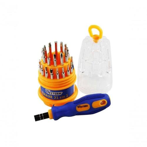 Descricao Chave forjadas em aco carbono com qualidade comprovadas. Indispensavel para pequenos reparos, utilizada em servicos de eletronica e em servicos que exigem uma delicadeza! com certeza essencial. - Caracteristicas: Jogo de chaves de precisao; Fabricado em aco carbono; Cabo plastico emborrachado ergonomico de alta qualidade; ou domestico. - Ideal para: Aparelho ; Aparelhos eletronicos; Telefonia; Computadores; Oculos; Relogio; Entre outros. *Imagens meramente ilustrativos. Especificacao Tecnica - Contem: 1 Cabo: 2,4 x 2,4 x 10,2cm 1 Estrela: 2.0 1 Chave Y: 3.0 1 Fenda U: 2.6 1 Triangulo: 3.0 1 Ponta redonda: 1.0 4 Philips: PH00, PH0, PH1 e PH2 8 Torx: T4, T5, T6, T7, T8, T10, T15 e T20 7 Fenda: 1,0, 1.3, 1.5, 2.0, 2.5, 3.0 e 4.0 6 Hexagonal: H1.5, H2.0, H2.5, H3.0, H3.5 e H4.0 - Tipo de Embalagem: Caixa litografada - Dimensoes da Embalagem: 5,5 x 5,5 x 12,2cm (CxLxA) - Quantidade Inner: 20 Pecas - Dimensoes Inner: 29 x 24 x 13cm (CxLxA) - Quantidade Master: 120 Pecas - Dimensoes Master: 60 x 26 x 40cm (CxLxA) - Material: Aco carbono, PP (Polipropileno) e PS (Poliestireno) - Cor: Laranja, Amarelo, Azul, Transparente, Prata e Preto - Marca: Western