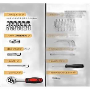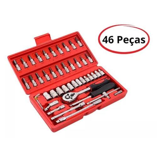 Kit chaves jogo catraca reversível soquetes 46 peças maleta Kit ferramenta 46 peças O kit de ferramentas com 46 peças é uma maleta com ferramentas uteis para manutenções que podem ser feitas em ambiente doméstico, para veículos, motocicletas e outros. A maleta conta com peças projetadas para o dia a dia, visando a facilidade e prontidão da manutenção sem muito desgaste. A maleta é feita de termo plástico leve que não amassa e comporta muito bem o peso das ferramentas. Já o material das ferramentas é feito de aço Cromo vanádio, feito para durar. Características: - o soquete usa aço cromado vanádio de alta qualidade 50 bv30 formação de prensa a frio, torque 50% maior que o de aço carbono, usa processamento de superfície lisa inferior, bom efeito de prevenção de ferrugem. - a cabeça do lote adota materiais cr-v, dureza mais forte, a resistência é mais alta. - chave de catraca de queda rápida ajustável positiva e negativa , o recurso de liberação rápida do botão garante que o soquete seja travado com segurança durante o uso, mas também permite fácil remoção ou troca rápida de soquete - a catraca de 45 dentes de alta qualidade pode melhorar a velocidade de operação. Pode ser em ar condicionado, porca de assento, para-choques, pneus, travas de porta de carro, casa contém básico , amplamente utilizado em bicicletas, estranguladores abertos, entre outras manutenções. Especificações: - 46 peças; - maleta de termo plástico; - ferramentas de aço cromo vanádio; - medidas 24x13x5 c, l, a ; - peso - encaixes de 1/4 padrão sextavados Lista de embalagem: - 13 soquetes : - 4 mm - 4,5 mm - 5 mm - 5,5 mm - 6 mm - 7mm; - 8 mm - 9 mm - 10 mm - 11 mm - 12 mm - 13 mm - 14 mm; - 21 soquete com bits: - ponta fenda: 4 mm - 5,5 mm - 7 mm; - ponta hexagonal: 3 mm - 4 mm - 5 mm - 6 mm - 7 mm - 8 mm - ponta philips: 1 - 2 - 3; - ponta pozi: 1 - 2 - 3; - ponta torx: t10 - t15 - t20 - t25 - t30 - t40; - 03 chaves hexagonais l: 1,5 mm - 2 mm - 2,5 mm; - 01 cabo fixo ; - 02 extensão 50 mm 2 e extensão 100 mm 4 ; - 01 extensão flexível 150 mm 6 ; - 01 catraca reversível com quick release: 15 x 2,7 x 2,3 cm. - 01 cabo de força t; - 01 junta universal; - 01 bit adaptador; - 01 maleta.