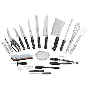 - Lâminas forjadas de aço inox especial;- Cabos de policarbonato reforçado com fibra de vidro;- Chaira com haste em aço inox com a superfície diamantada;-Pedra para afiar dupla face com grãos mistos para duas opções de afiação e suporte antideslizante que oferece maior durante o uso;- Batedor, peneira, descascador, rapador e pinça em aço inox;-Espátula e pegador de silicone com cabo de aço inox que permite uso em temperaturas de até 210 C.;- Pincel de silicone que permite uso em temperaturas de até 210 C;- Termômetro digital com haste de aço inox e visor de cristal líquido;- Faca para ostra com lâmina de aço inox e cabo de polipropileno antiderrapante;- Estojo de nylon que oferece uma proteção as peças, permitindo o e armazenagem com maior . Ean: 7891112129863