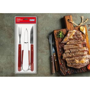 Kit para churrasco Fixxar Essencial, composto por 03 peças de cabo de madeira e aço inoxidável que garante melhor corte e maior durabilidade do produto.Itens inclusos:- 1 Faca 36 cm- 1 Garfo 35 cm- 1 Pegador / Pinça 34 cm- Espessura: 1mmDiferenciais:- Kit completo com 03 peças;- Tudo que você precisa para preparar aquele delicioso churrasco está nesse kit;- Peças produzidas em aço inoxidável com cabo de madeira que garante maior durabilidade para o produto;- Design moderno e inovador;- Ótima opção de presente para aniversário, dia dos pais, dia dos namorados, presente para sogro, presente para filho e demais churrasqueiros;Medidas aproximadas da embalagem:41 x 17 x 5 cmPeso aproximado da embalagem:380 gramasEmbalagem:Blister duplo
