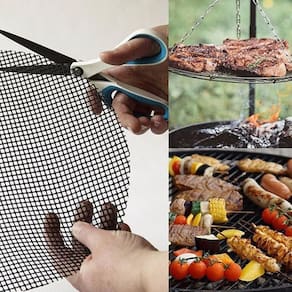 Kit para churrasco, acompanha tapete antiaderente que pode ser colocado diretamente sobre a grelha, resiste a altas temperaturas, a manta antiaderente permite que inclua alimentos pequenos como camarões, legumes, peixes no seu churrasco e o melhor de tudo é que não grupa pois possui revestimento antiaderente facilita a limpeza, o kit também acompanha garfo e faca com cabo longo de madeira.
