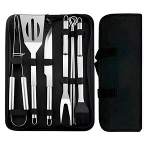 O conjunto vem com 10 peças. Ideal para ter na sua churrasqueira, não sendo necessário procurar cada utensílio na hora de preparar um delicioso churrasco.