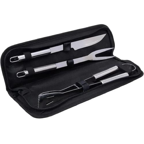 - material da faca: aço inoxidável. - material do garfo: aço inoxidável. - material do pegador: aço inoxidável. - material do estojo: poliester - garantia: indeterminada